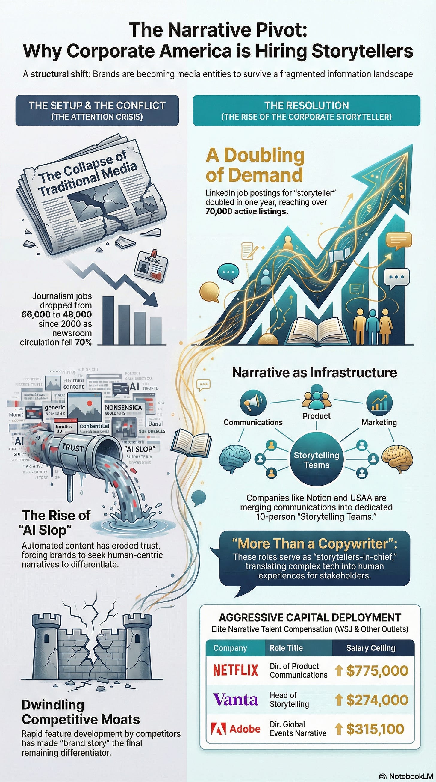 As this WSJ story indicates, this has created a tremendous surge in demand for true brand storytellers by combining old functions like communications, product, marketing, and media into a single storytelling powerhouse.
