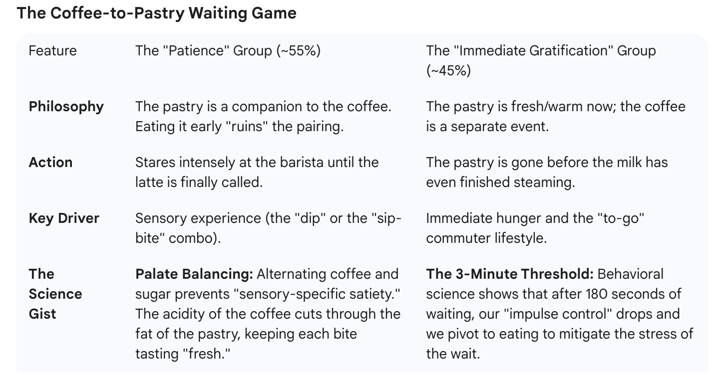 If we overlay this on the coffee scenario, then if a coffee shop patron doesn't trust that the "second reward" (the latte) will arrive in a timely or reliable fashion, the most logical survival strategy is to consume the "first reward" (the pastry) immediately.