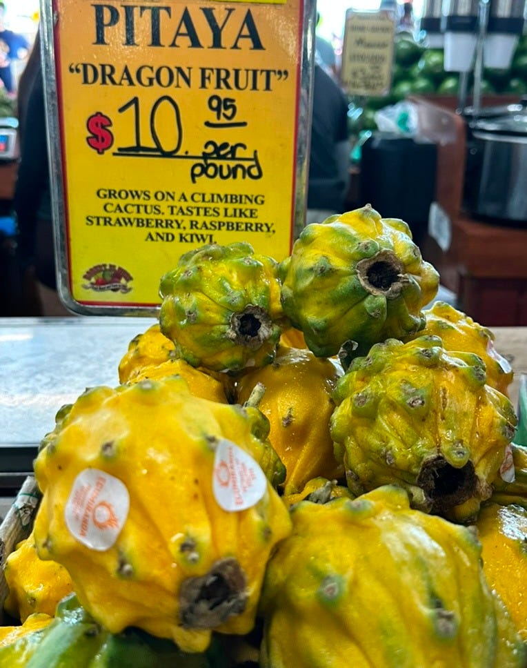 As I was walking through the various fruit stands, I came across this strange, yellow-jagged shell Pitaya fruit.